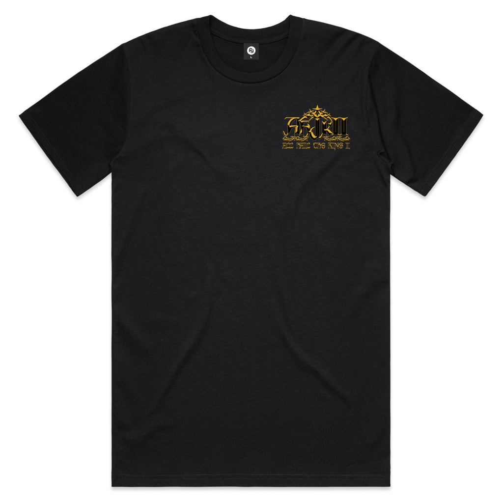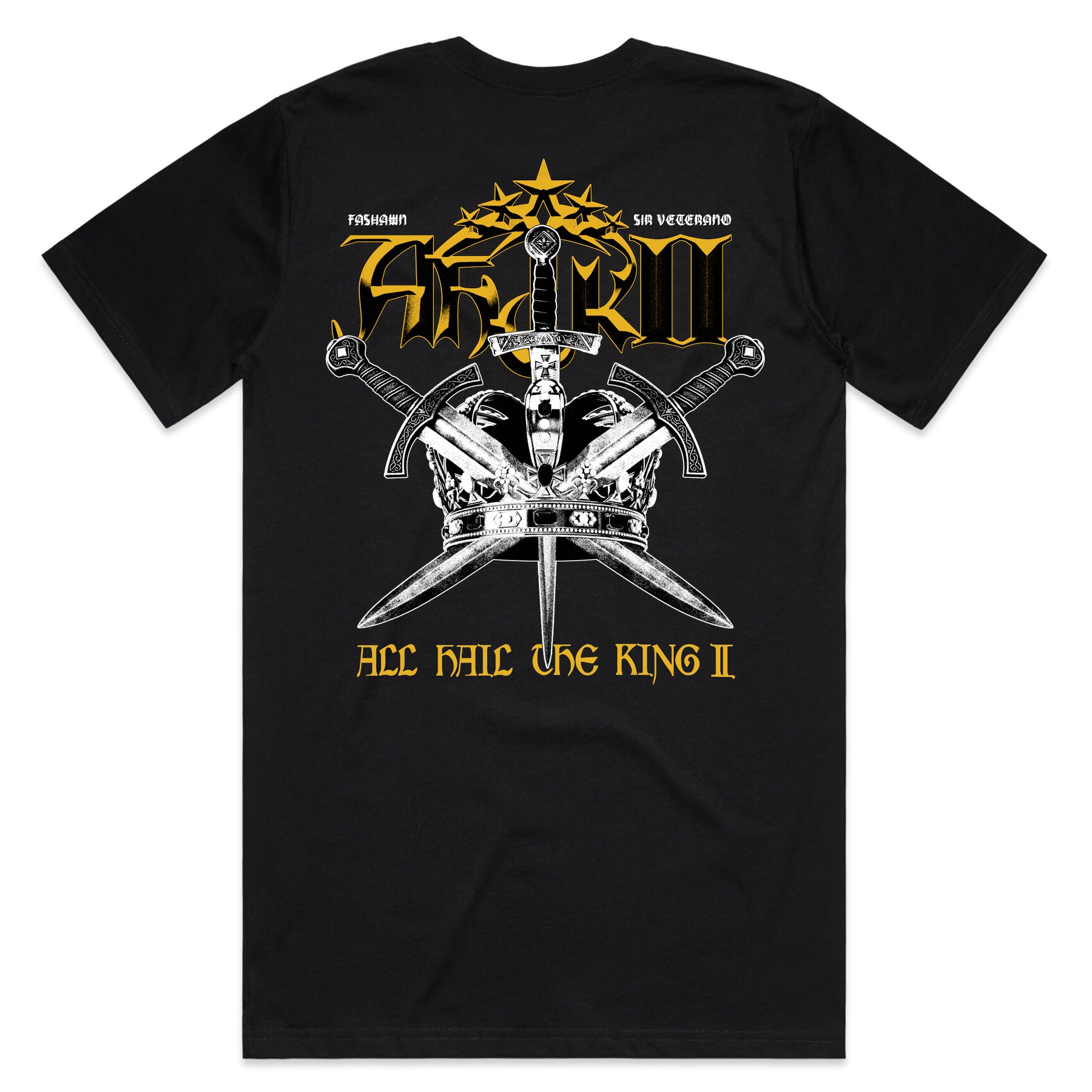 Official "All Hail The King II" apparel. Screenprint front and back on premium heavyweight tee. Design also available in white t-shirt.